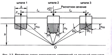 Нормальные напряжения в балластном слое и на основной площадке земляного полотна определяются на глубине h от подошвы шпалы в сечении пути под расчетным колесом, Расчетное колесо располагается по направлению оси шпалы.