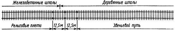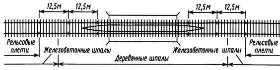 Рисунок 4.4. Схема расположения железобетонных и деревянных шпал при перекрытии мостов рельсовыми плетями.