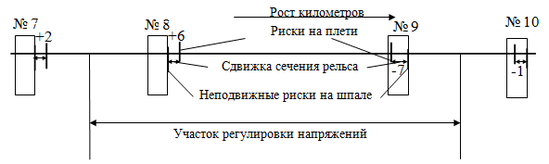 на 7-й «маячной» шпале сдвижка + 2 мм (+ при смещении в направлении роста километров), на 8-й + 6 мм, на 9-й (–7) мм, на 10-й (– 1) мм.