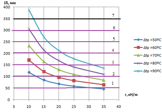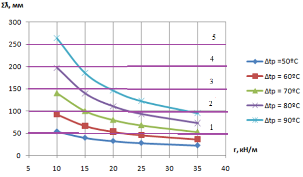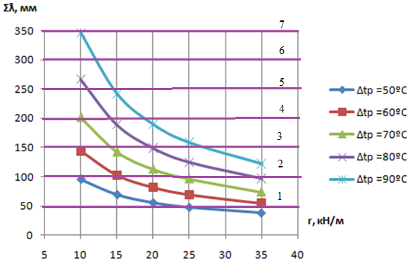 Рисунок 5.6 - Изменение суммы зазоров в уравнительном пролете (3×12,5м) от перепада температуры рельсов при охлаждении (r = 35 кгс/м)