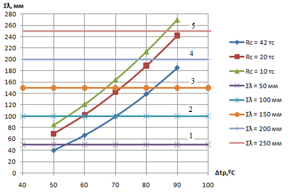 Для более наглядного представления изменения суммы зазоров от перепада температуры рельсов при охлаждении при различном погонном и стыковом сопротивлением построены графики (рисунок 5.6-5.13).