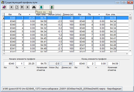 После ввода исходных данных выполняется проектирование реконструкции продольного профиля существующего железнодорожного пути.