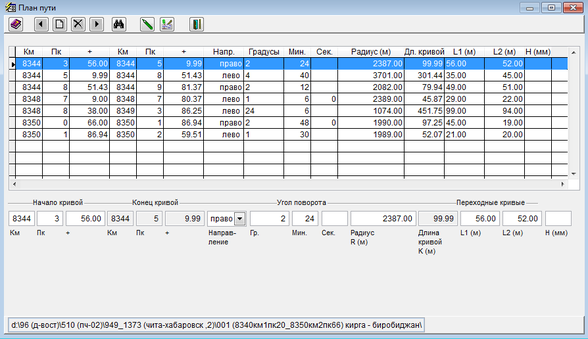 Работа начинается с ввода данных об участках пути (наименование участка, действительный километраж участка, данные о плане, продольном профиле, спрямленном профиле пути, профиле бровки, земляном полотне и т. д.), неправильных километров и пикетов. Далее вводятся данные по плану участка (Рисунок 2.1): начало кривой, направление, угол поворота, радиус, длины переходных кривых и возвышение наружного рельса в кривой. Величина длины и конца кривой вычисляются программой автоматически.