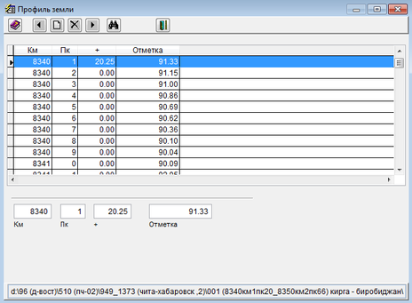Далее в программу вводится профиль земли (километр, пикет и отметка земли) Рисунок 2.3