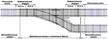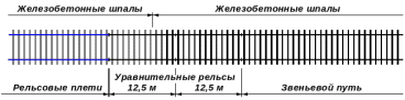 В случае примыкания бесстыкового пути к звеньевому или к стрелочным переводам, на примыкании должны быть уложены две пары уравнительных рельсов длиной 12,5м.