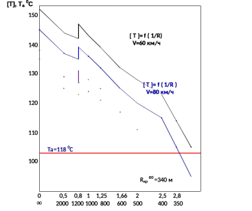 Рисунок 5.2- Допускаемые по условию прочности рельсов понижения температуры и повышения температуры по условию устойчивости пути в зависимости от кривизны