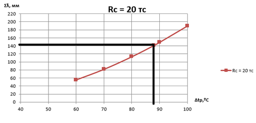 Величина зазора в каждом стыке и их сумма в уравнительном пролете будет зависеть от величины сопротивления в стыке Rc и погонного сопротивления за счет промежуточного скрепления в активной зоне плети и в пределах уравнительных рельсов r. Возьмём график изменение суммы зазоров в уравнительном пролете (3×12,5м) от перепада температуры рельсов при охлаждении (r = 20 кгс/м)