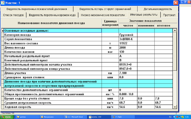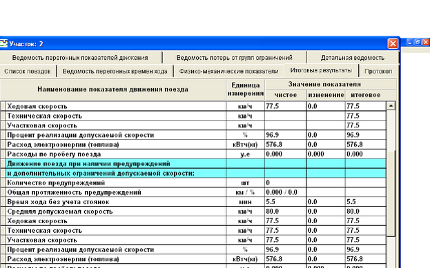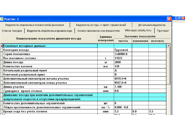 Рис.2.6 Итоговые результаты тяговых расчетов до реконструкции пути