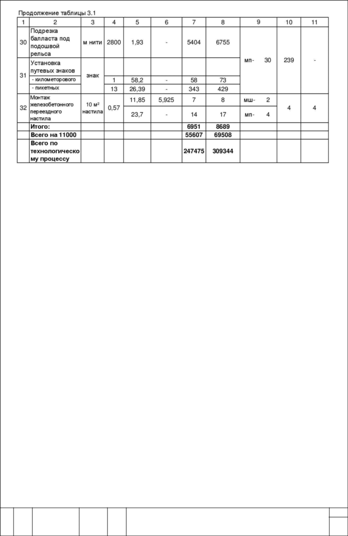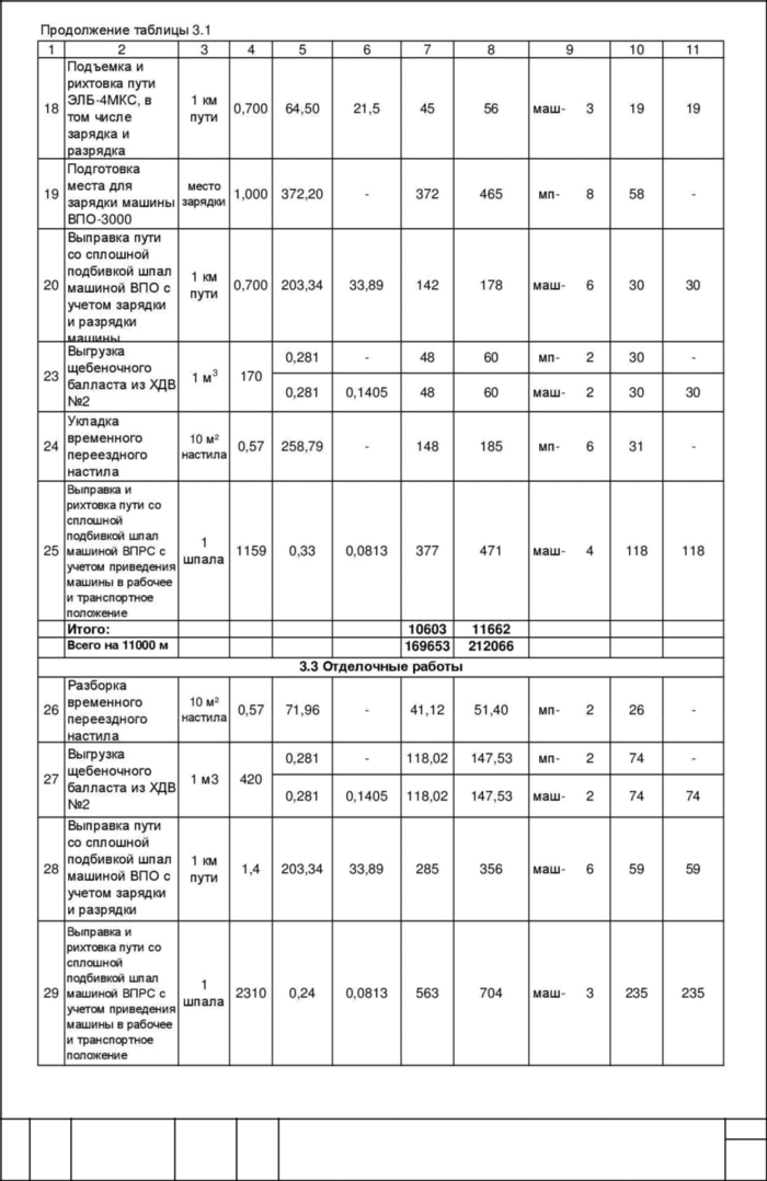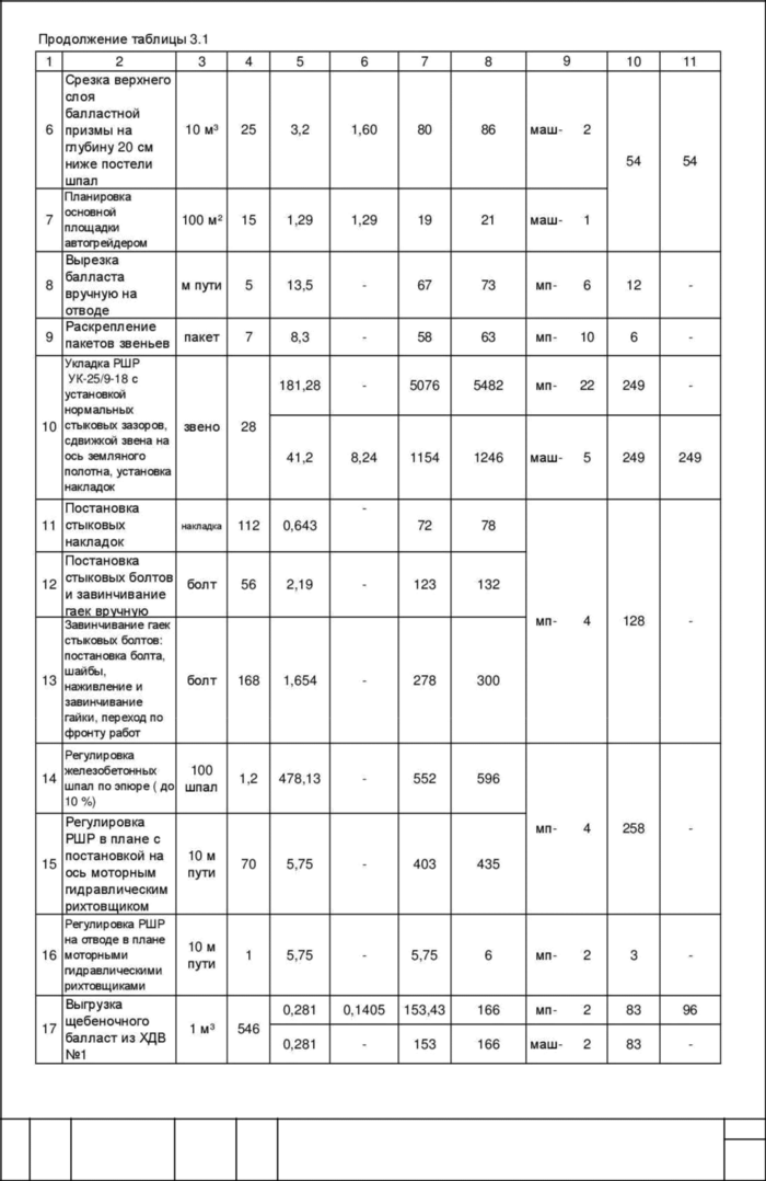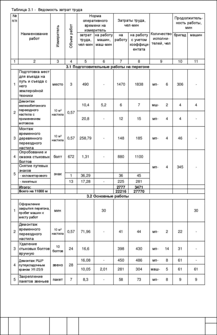 Объемы работ рассчитываем в соответствии с протяженностью фронта работ в “окно”. Затраты труда определены для каждой отдельной работы в соответствии с нормами времени на подготовительные работы, основные работы в “окно” и отделочные работы. Результаты расчетов представлены в ведомости затраты труда по техническим нормам по форме, приведенной в таблице 3.1. График основных работ в “окно” представлен на рисунке 3.4 (Лист № 6). Графики подготовительных и отделочных работ представлены на рисунках 3.5 и 3.6 соответственно (Лист № 7).