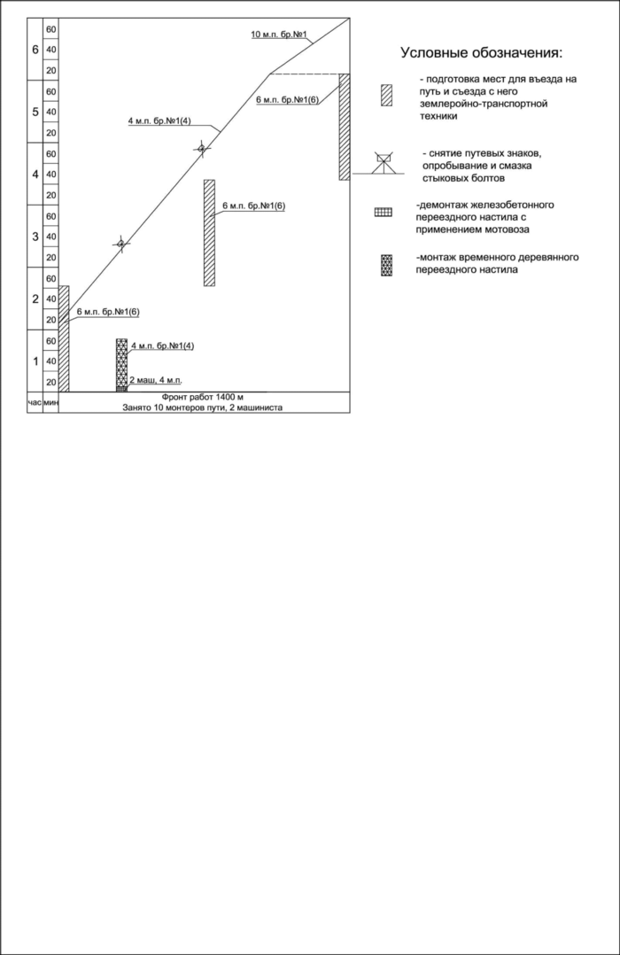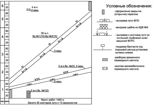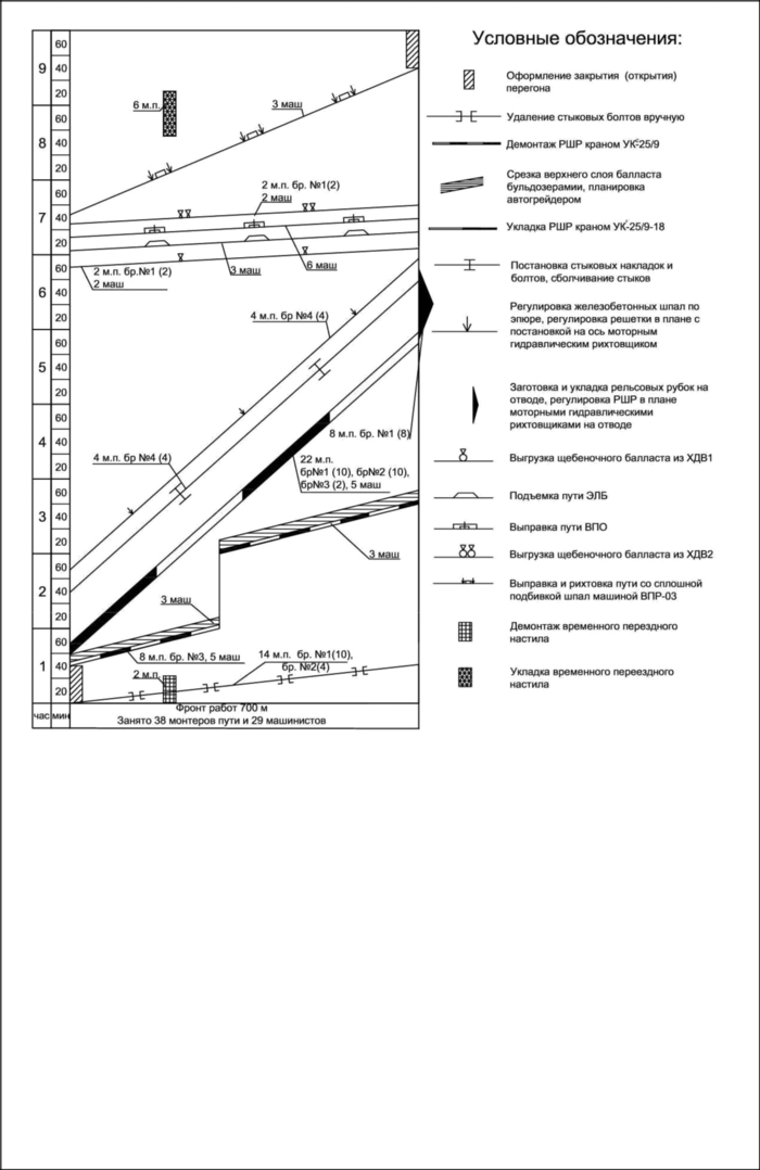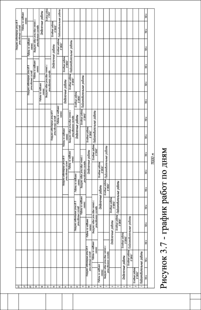 Основные работы в “окно” производятся на участке протяженностью 700 м во время закрытия перегона на 9 часов. Начало действия “окна” должно предоставляться таким образом, чтобы работы выполняемые бригадами монтеров пути осуществлялись в светлое время суток, а работа машин производилась в темное время суток. Календарный график производства работ по дням представлен на рисунке 3.7 (Лист №8). Полный комплекс работ на участке проходит в течение 22 суток.