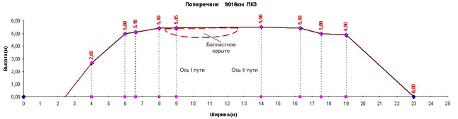 Рис. 2.1. Схематичный поперечный профиль земляного полотна 9016 км ПК 3
