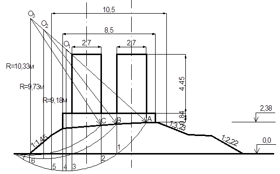 Расчет устойчивости откоса насыпи выполняем по нескольким вероятным кривым сдвига. Из возможных вариантов необходимо определить такую поверхность сдвига, коэффициент устойчивости Куст по которой окажется наименьшим (Кmin). Эта задача решается построением ряда вероятных кривых сдвига и определением для них коэффициентов устойчивости.