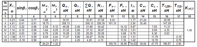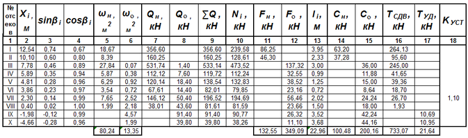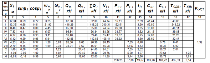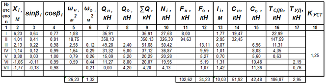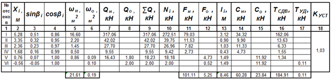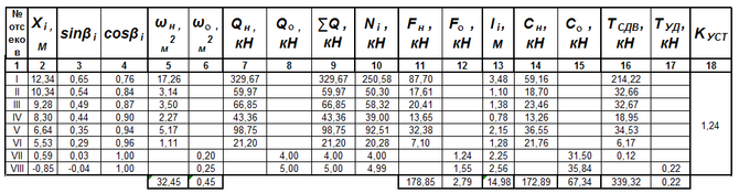 Таблица 4.1- Расчет коэффициента устойчивости откоса насыпи по кривой смещения А. Радиус кривой R1 = 16,93 м