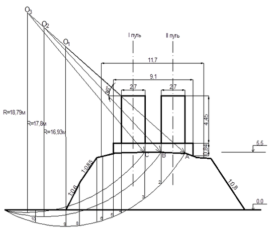Расчет устойчивости произведен графо-аналитическим методом для 1 пог. м длины насыпи. Устойчивость откосов земляного полотна определяется коэффициентом устойчивости Куст. Физический смысл которого заключается в отношении моментов сил, удерживающих грунт откоса от смещения Муд, к моментам сил сдвигающих его Мсдв. Моменты сил берутся относительно центра кривой смещения.