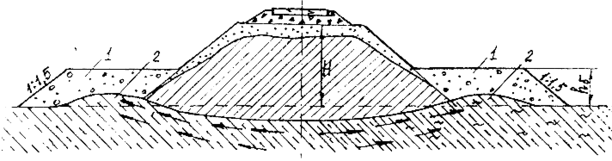 Рис. 3.8. Укрепление откосов насыпи пригрузочными бермами: 1- пригрузочная берма; 2- бугры выпирания