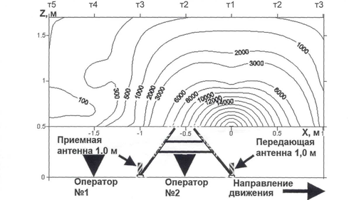 Рис. 5.1 Изолинии распределения расчетного уровня энергетических экспозиций ЭЭ, (В/м2) ч, в диапазоне частот от 30 до 300 МГц за 8-ми часовую смену, в плоскости Z-X (треугольники показывают наиболее типичные места нахождения операторов при выполнении георадарного профилирования; точка расположения антенны с координатами Х=0, Z=0).