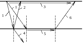 Рис. 4.1 Схемы хода лучей сейсмических волн различных типов: 1 – падающая; 2 – отраженная; 3 – прямая; 4 – преломленная проходящая; 5 – преломленная скользящая; 6 – преломленная головная; верхняя горизонтальная линия – дневная поверхность; нижняя горизонтальная линия – поверхность раздела сред.