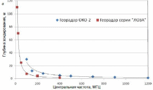 Рис. 4.3 Зависимость влияния центральной частоты антенного блока георадара на информативную глубину разреза