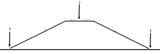 Рис. 4.5 Поперечный профиль железнодорожной насыпи. Стрелками обозначены сечения, в которых проводилось георадарное