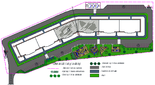 Вдоль главного фасада запроектированы широкие тротуарные дорожки, которые в случае пожара используются как подъездные пути для пожарных машин. Вдоль тротуара запроектированы фонари.