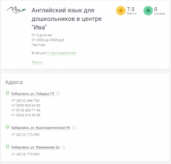 Наиболее масштабной задачей использования REST-сервисов было получение данных о секциях с проекта «Справочник» через REST API. Проект «Справочник» представляет собой огромную базу компаний, существующих в Хабаровске и Владивостоке. Так как нерентабельно держать одни и те же данные в нескольких местах, «Справочник» предоставляет REST API для получениях данных. Таким образом, «Справочник» является провайдером данных для других проектов, таких как «Секции», например.