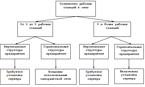 Следуя из схемы выбора типа сети, можно решить, что в данном случае требуется установка сервера, так как мы имеем вертикальную структуру предприятия, то есть разграниченный доступ к информации.