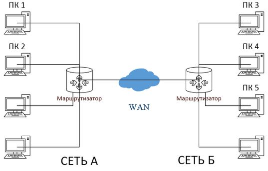 Рассмотрим, что произойдет, если компьютер 1 из сети А, захочет отправить пакет данных, находящемуся в сети к компьютеру №5.