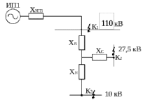 Для расчета токов КЗ необходимо составить схему замещения. Поскольку имеется информация о величине мощности КЗ на шинах ОРУ-110 кВ, то рассчет ведем непосредственно, начиная с шин ТП. Схема замещения представлена на рисунке 2.2.
