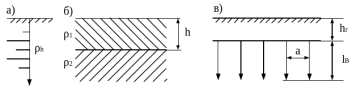 - реальный грунт с изменяющимся по глубине удельным сопротивлением ρh заменяется эквивалентной двухслойной структурой с толщиной h и сопротивлениями верхнего и нижнего слоя ρ1 и ρ2 соответственно (Рисунок 5.1, а, б).