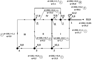 Далее на рисунке 3 проставляем узловой расход для узлов 1-7, расход от водопроводной башни и подачу насосами второго подъема. Определяем расход и диаметр на каждом участке сети (предварительно). Минимальный диаметр трубопроводов принимается равным 100 мм.