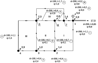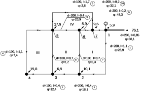 | Участок | Кольцо | Длина, км | Тип труб | Диаметр, мм | Расход, л/с | Скорость, м/с | Потери напора,м | |||||||