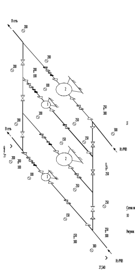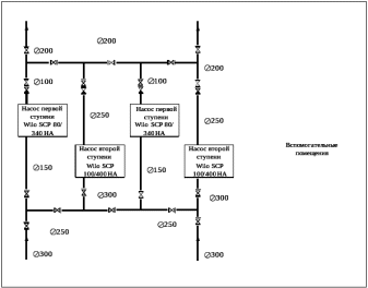 Схема размещения насосов в машинном зале с определенными диаметрами внутристанционных трубопроводов, представлена на рисунке 9.