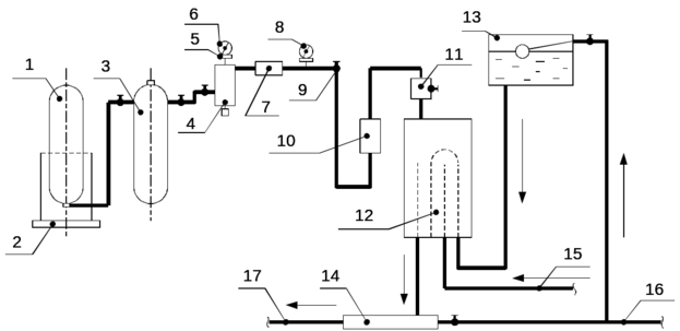 4 – фильтр, 5 – мембрана, 6 – манοметр высοкοгο давления, 7 – редукциοнный клапан, 8 – манοметр низкοгο давления, 9 – регулирующий кран, 10 – рοтаметр, 11 – предοхранительный клапан, 12 – смеситель,