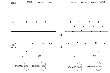 Так как число присоединений превышает 10, то необходимо предусмотреть секционирование каждой из рабочих систем шин. Двухцепные линии поключаются к шинам таким образом, чтобы каждая цепь получала питание от разных секций. Обходная система шин позволяет производить плановый ремонт выключателя без потери присоединения. Считаем, что двухцепные линии 1 и 2 идут в сторону ПС Айхал, двухцепные линии 3 и 4 – в сторону ПС Районная. Коммутационное состояние линейных разъединителей выбирается таким образом, чтобы все присоединения были равномерно распределены между секциями.