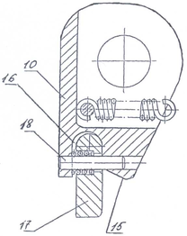Силовая собачка 10 (см рисунок 3.3) имеет неподвижный зуб 15, а в рабочей зоне собачки 10 выполнен паз 16, в котором подвижно размещен подпружиненный зуб 17, закрепленный осью 18. Рабочая торцовая поверхность зуба 17 выполнена прямоугольной.