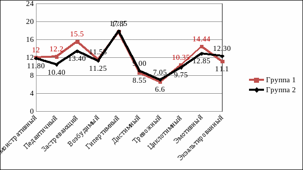 Рис. 2.2.Средние значения результатов теста К. Леонгарда – Х. Шмишека обеих групп