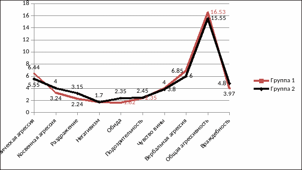 Рис. 2.3. Средние значения результатов опросника Басса-Дарки обеих групп