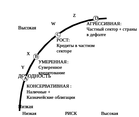Совокупность сочетаний доходности и сопряженных с ними рисков можно изобразить в виде кривой, на которой банк может занимать различные положения. Чем больше рисков банк будет готов принять, тем выше окажется ожидаемый доход. В частности, в точке C (кредитование бизнеса) он может получить доходность выше, чем в точке B (только суверенное кредитование).