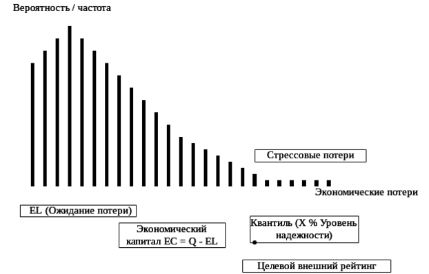 Величина потерь с наибольшей вероятностью реализации называется ожидаемыми потерями (Expected Losses, EL). Разница между стоимостью под риском и ожидаемыми потерями носит название «непредвиденных потерь» (Unexpected Losses, UL), а также «экономического капитала» (Economic Capital), или «требований к капиталу» [23].