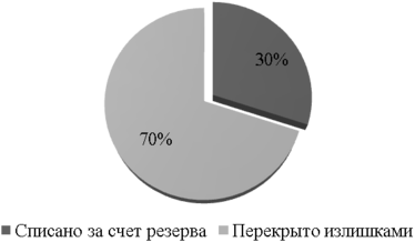 70% недостач урегулируются за счет излишков возникающих в последующих операционных циклах, 30% списывается Комиссией Банка за счет создаваемого резерва на возможные потери Банка. На рисунке 2.4 изображены способы урегулирования. При этом списанная за счет резерва сумма составляет 1,43% от общей суммы зарегистрированных недостач [20].