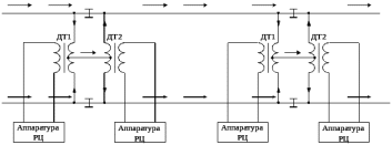Как следует из рисунка 1.3, тяговые полутоки в каждой рельсовой нити протекают в одном направлении. Дойдя до следующего дроссель-трансформатора они, проходя через обе половины основной обмотки, стекаются к средней точке и по междудроссельной перемычке суммарный ток попадает к средней точке дроссель-трансформатора. Далее ток разветвляется по обеим половинам основной обмотки и снова в виде полутоков протекает по рельсовым нитям до изолирующих стыков, которые обтекает с помощью следующей пары дроссель-трансформаторов.