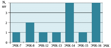 Из диаграммы рисунок 1.5, следует, что больше всего (по 4 случая) отказов технических средств приходится на ЭЧК-14 (ст. Вяземская) и ЭЧК-16 (ст. Бикин), в два раза меньше отказов (2 случая) на ЭЧК 8 (ст. Ин), у остальных районов контактной сети зафиксировано по одному событию. Исходя из этого, участками для дальнейшего рассмотрения проблемы асимметрии обратного тягового тока являются ЭЧК-14 и ЭЧК-16, как участки с наибольшим количеством отказов элементов цепи канализации обратного тягового тока.