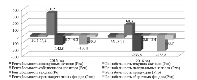 Отрицательным моментом выступает снижающееся значение рентабельности материальных запасов, так в 2014 году на 1 рубль материальных запасов приходилось -0,52 руб. прибыли до налогообложения, значение показателя рентабельности в 2015 году существенно снизилось и составило -1,43 руб., в 2016 году также снизилось до -2,34.