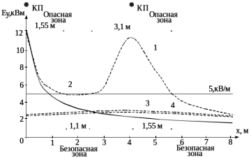 Проведен анализ напряженности электрического поля контактной сети переменного тока над головой человека, при различных вариантах подвеса КП, на однопутном и двухпутном участках пути. Как видно из полученных зависимостей, опасное влияние напряжённости наблюдается непосредственно в близи источника электрического поля (зависимости:1 - двухпутный участок h=6,8 м; 2 - Однопутный участок h=6,8), расстояние вредного влияния 1,55 метров от оси подвеса КП. Для остальных зависимостей (3-4), которые получены не вблизи КП, напряжённость ЭП - в приделах нормы. Предельно допустимое время пребывания в зонах, напряжённость которых превышает или рана 5 кВ/м, не должна превышать рабочего дня. Это значительно улучшит здоровье работников выполняющих обслуживание контактной сети и воздушных линий.