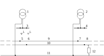 Рисунок 10 – Схема электроснабжения межподстанционной зоны: 1,2 – понижающие трансформаторы; 3,4 – сборные шины; 5-8 – фидера контактной сети 9 – нечётного пути, 10 – четного пути, 11 – рельсовая цепь; 12 – тяговая нагрузка