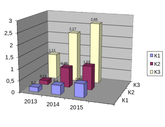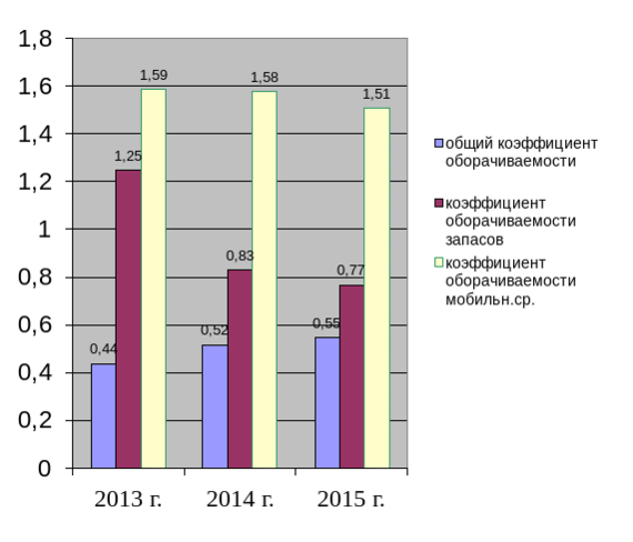 За 2013 – 2015 гг. значение общего коэффициента оборачиваемости, отражающего эффективность использования всех ресурсов предприятия, составляет соответственно 0,44, 0,52 и 0,55, что указывает на увеличение кругооборота средств предприятия. На каждый рубль активов ООО "Торговое оборудование" реализовано продукции за 2013 – 2015 гг. соответственно на 0,44 руб., 0,52 руб. и 0,55 руб. Динамика данного коэффициента за 2013 – 2015 гг. представлена на рисунке 6.