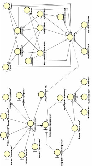 От главного интерфейса наследуются два – для Администратора и для Директора. Они отличаются по функционалу, который должен быть доступен в разной степени для различных пользователей. Управляющие классы отвечают за выполнение сложных вычислений и управление другими объектами. Например, класс «Отчеты» отвечает за формирование отчетов о клиентах, абонементах или расписании.
