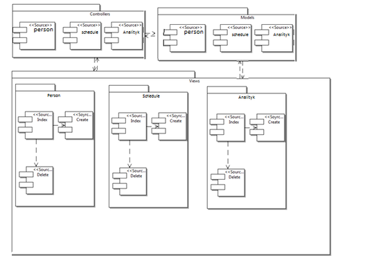 На представленной диаграмме видны все компоненты. Они разделены на три взаимозависимых блока согласно шаблону проектирования дипломной работы: Models (модели), Controllers (контроллеры), Views (представления). Блок Models содержит в себе классы, описывающие модель базы данных. Блок Controllers содержит в себе классы, которые обеспечивают связь между системой и пользователем. Блок Views разделен на разделы и подразделы, которые содержат в себе элементы отображения данных для пользователей то есть элементы пользовательского интерфейса.