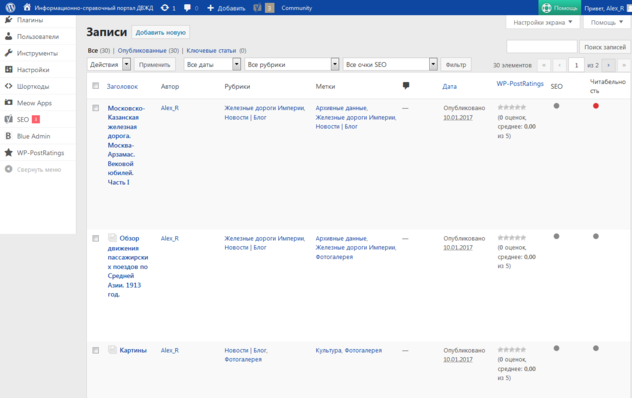 Например, раздел «Записи» - показывает количество записей на сайте, их системную информацию, будь то дата создания или рейтинг, позволяет создавать, редактировать и удалять записи.