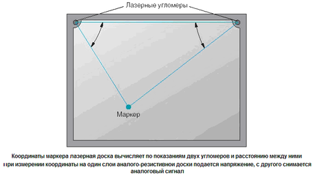 В систему входят два инфракрасных лазерных угломера, обычно располагаемых сверху по углам доски. Угломер работает довольно просто: вращающееся с постоянной угловой скоростью зеркало направляет ИК-луч так, чтобы он, подобно антенне радара, из одной точки сканировал всю поверхность доски. Лучи ИК - лазеров отражаются от «воротничка» маркера и регистрируются фотодатчиками. Система запоминает угол поворота зеркала в момент фиксации отраженного блика. Затем на основании расстояния между угломерами и значений углов встроенный микропроцессор вычисляет координаты кончика пера (рисунок 1.5).